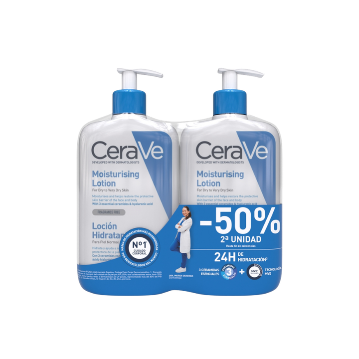 La piel seca o muy seca necesita hidratación intensa y duradera, especialmente en zonas extensas del cuerpo. Con el Duplo CeraVe® Loción Hidratante 473 ml, obtienes dos envases en un solo pack, ideal para asegurar hidratación diaria en todo el cuerpo y mantener la piel protegida, suave y confortable.